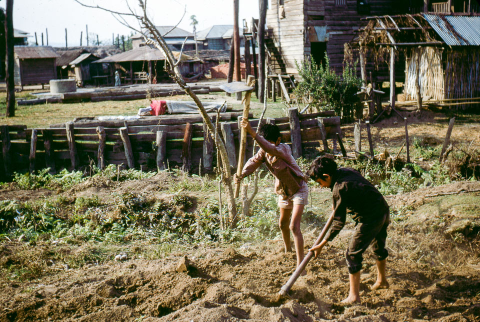Caption: Date: 1967 Location: Sanischare, Jhapa Description: School boys preparing soil for planting in the school garden. Keywords: Beth Prentice, Bob Frank, Nepal Photo History Project, Peace Corp Photo History, agriculture, community, outdoor class, planting, school
