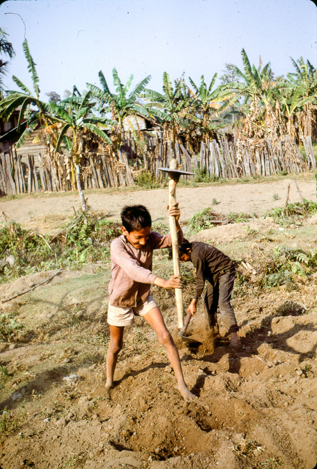 Caption: Date: 1967 Location: Sanischare, Jhapa Description: School boys hoeing their plot in the school garden. Keywords: Beth Prentice, Bob Frank, Nepal Photo History Project, Peace Corp Photo History, agriculture, community, outdoor class, planting, school