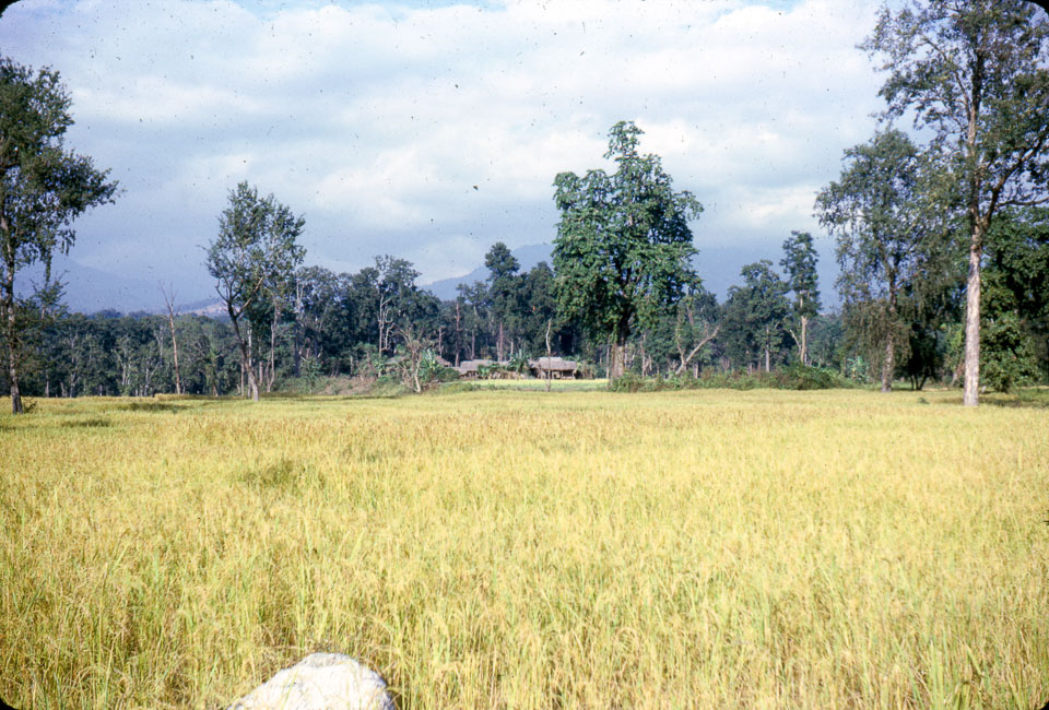 Caption: Date: 1968 Location: Sanischare, Jhapa Description: Jungle homestead just beyond the field outside of the village. Keywords: Beth Prentice, Bob Frank, Nepal Photo History Project, Peace Corp Photo History, agriculture, countryside, field, landscape