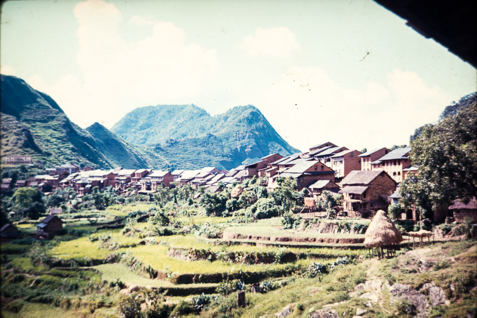 Caption: Date: 1966 Location: Bandipur, Tanahun Description: View of the town from a footpath outside of the town. Keywords: Bill Hanson, Nepal Photo History Project, Peace Corp Photo History, landscape, town, village