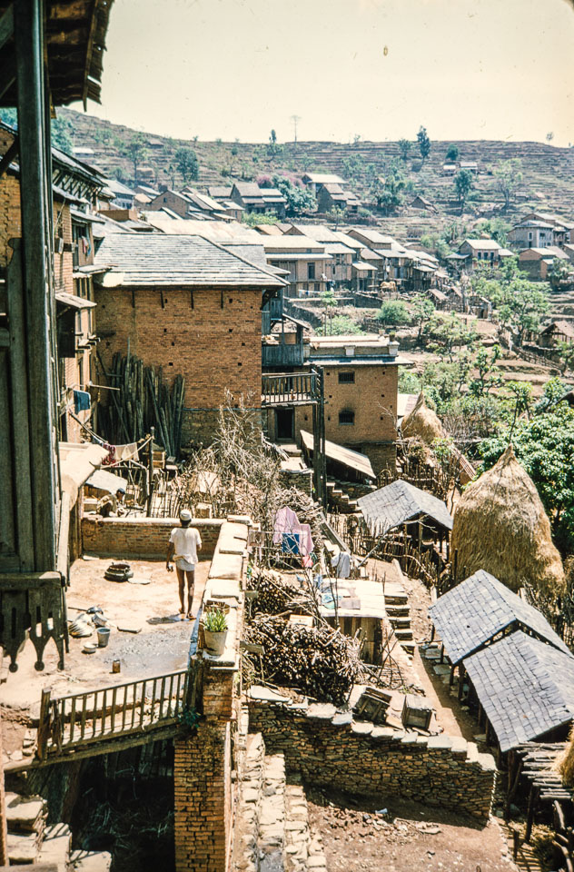 Caption: Date: 1966 Location: Bandipur, Tanahun Description: View of the backside of the bazaar's buildings. Keywords: Bill Hanson, Nepal Photo History Project, Peace Corp Photo History, home life, house exterior, landscape, town, village