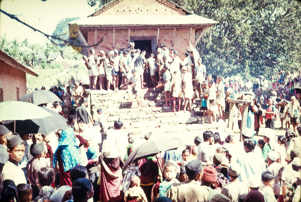 Caption: Date: 1965 Location: Bandipur, Tanahun Description: People at the temple with offerings for a puja. Keywords: Bill Hanson, Nepal Photo History Project, Peace Corp Photo History, community, event, holiday, temple