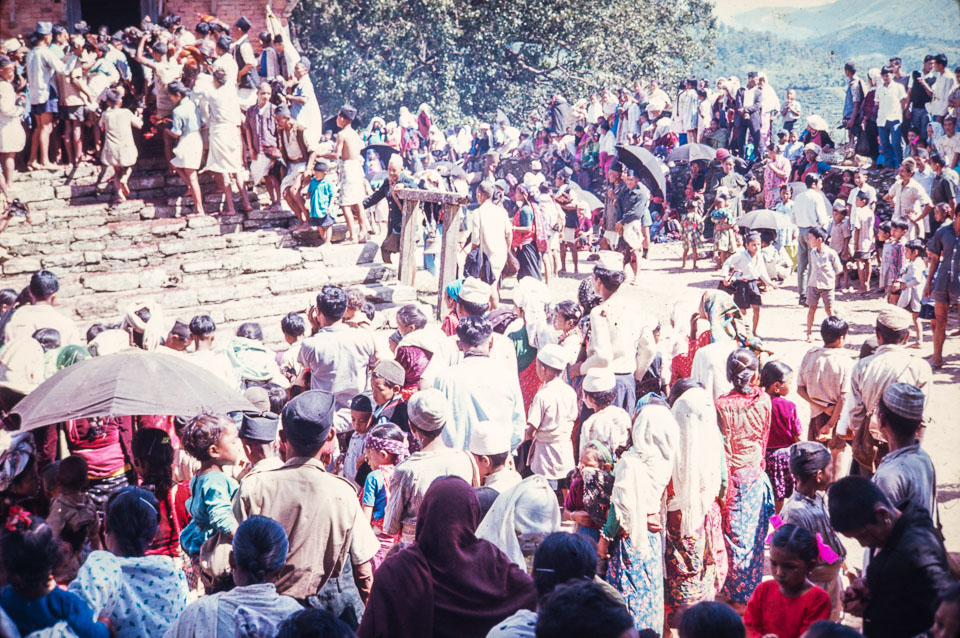 Caption: Date: 1965 Location: Bandipur, Tanahun Description: Crowds waiting to make offerings at the temple. Keywords: Bill Hanson, Nepal Photo History Project, Peace Corp Photo History, community, event, holiday, temple