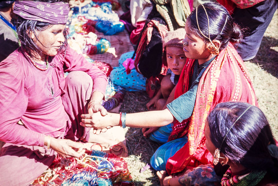 Caption: Date: 1966 Location: Bandipur, Tanahun Description: Woman buying glass bangles and putting them on. Often they break. Keywords: Bill Hanson, Nepal Photo History Project, Peace Corp Photo History, commerce, haat, market