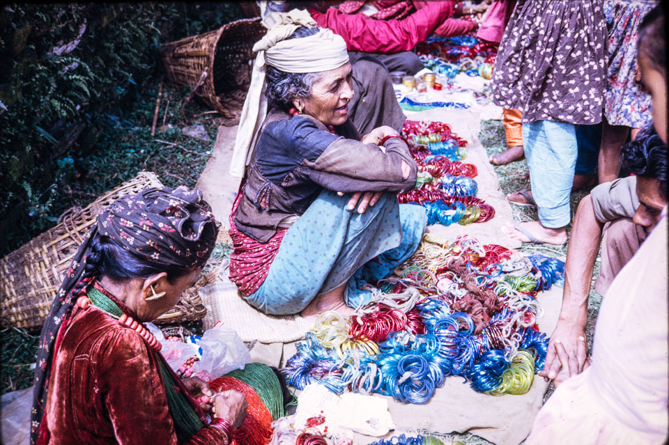 Caption: Date: 1966 Location: Bandipur, Tanahun Description: The clever bangle seller does a brisk business. Keywords: Bill Hanson, Nepal Photo History Project, Peace Corp Photo History, commerce, haat, market
