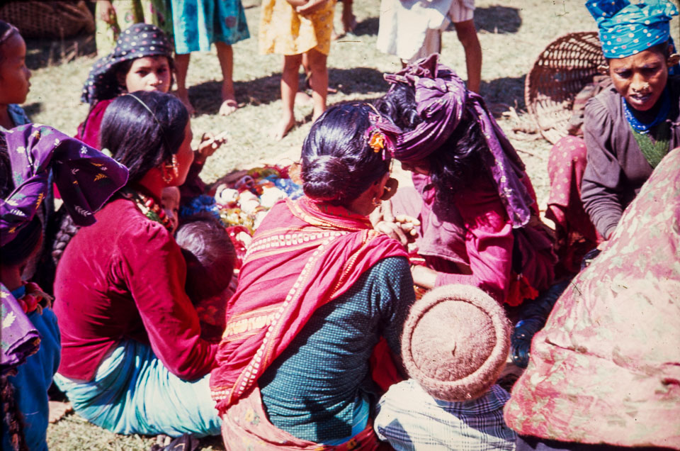 Caption: Date: 1966 Location: Bandipur, Tanahun Description: Getting a peek at the bangle seller. Keywords: Bill Hanson, Nepal Photo History Project, Peace Corp Photo History, commerce, haat, market
