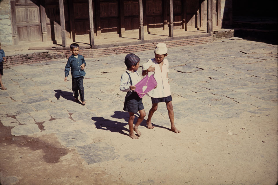 Caption: Date: 1966 Location: Bandipur, Tanahun Description: Three boys ready to play with their kites. Keywords: Bill Hanson, Nepal Photo History Project, Peace Corp Photo History, home life, play time