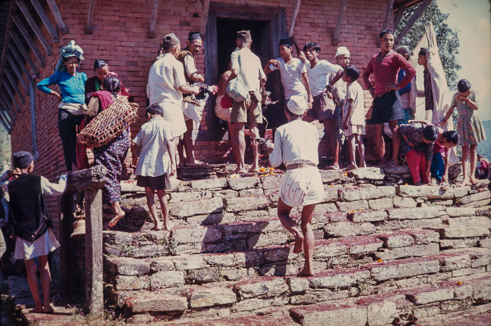 Caption: Date: 1966 Location: Bandipur, Tanahun Description: Animal sacrifices being made at the temple door. Keywords: Bill Hanson, Nepal Photo History Project, Peace Corp Photo History, community, event, holiday, temple