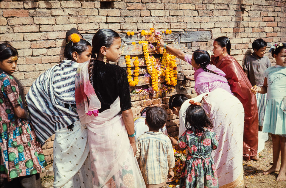 Caption: Date: 1966 Location: Bandipur, Tanahun Description: Women offering garlands outside the temple. Keywords: Bill Hanson, Nepal Photo History Project, Peace Corp Photo History, People, community, temple