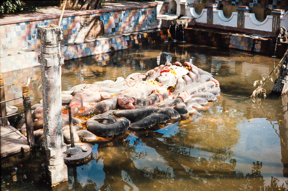 Caption: Date: 1969 Location: Budhanilkantha, Kathmandu Description: Sleeping Vishnu in water. There was a story that the King should never visit as He is a reincarnation of this Vishnu. According to legend If he were to visit he would die. No King ever visited this holy site. Keywords: Bill Hanson, Nepal Photo History Project, Peace Corp Photo History, community, statue, temple
