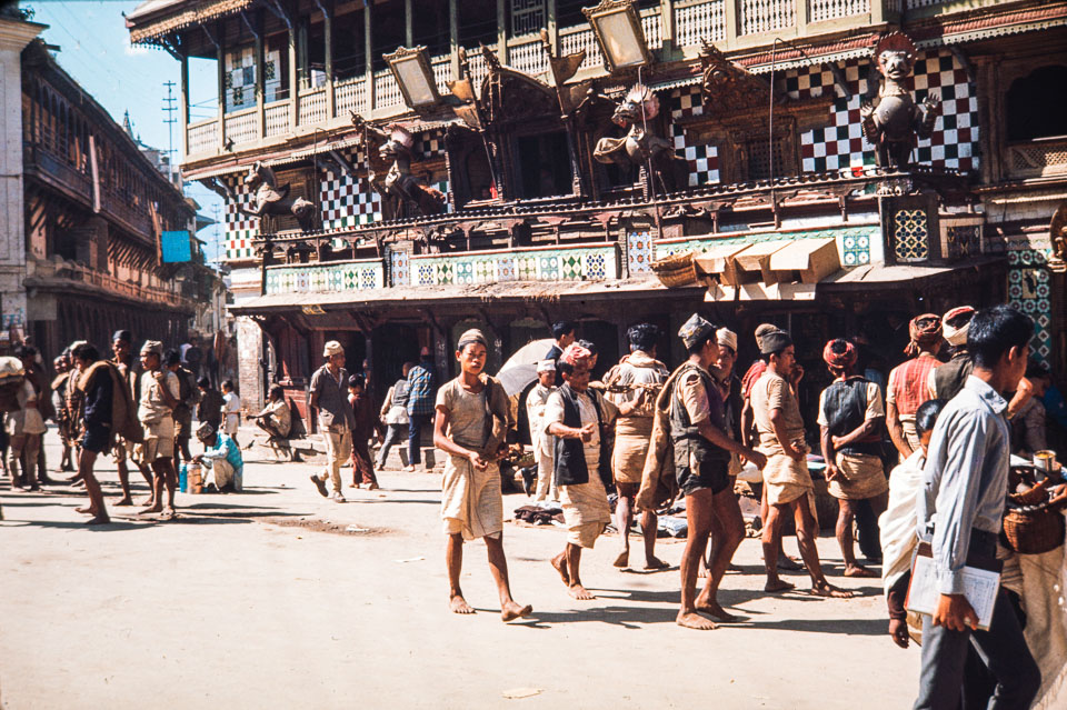 Caption: Date: 1969 Location: Kathmandu, Kathmandu Description: Street scene in the bazaar. Keywords: Bill Hanson, Nepal Photo History Project, Peace Corp Photo History, community, street scene, temple