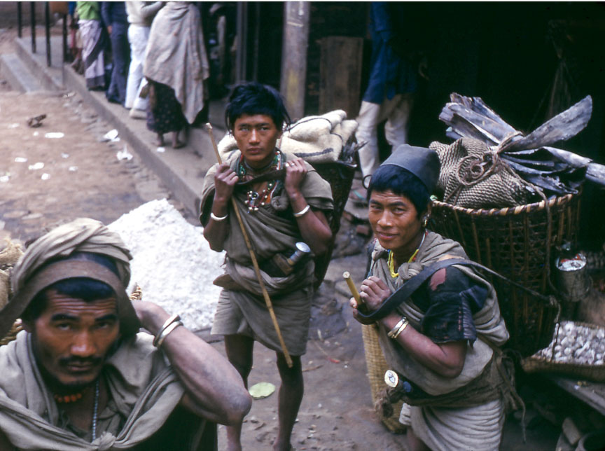 Date: 1966-04 Location: Baglung, Baglung Description: Three men came into the Baglung bazaar to trade their goods for needed supplies. The pile of salt behind them and items in their dokhos were traded for items to take back to their village.