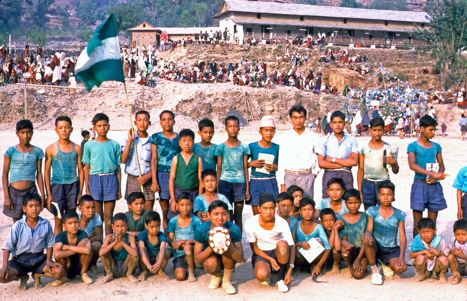 Description: Bharse High School celebrates its founding with a holiday and school wide athletic competition and picnic. The event is held on Baisakh Ek (roughly corresponding to early April). The Green Team was the victor in 1966 and were awarded the school trophy. Following the competition all students, their families and villagers from the area celebrate with a feast.