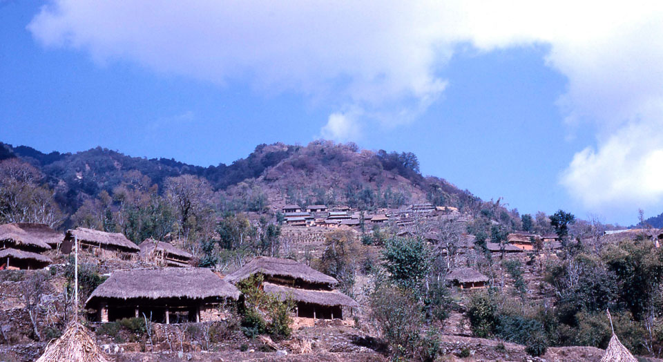 Description: In 1966 Bharse was a village carved out of a forested area in central west Nepal maybe 50 years earlier. Terraced fields and houses were constructed. This view is from Bharse High School looking east up the hill. Houses seen in the top center have slate roofs and are sturdier but more expensive. Thatch roofs as seen in the foreground are more common because roofing material is easier to get and they are cheaper to build.