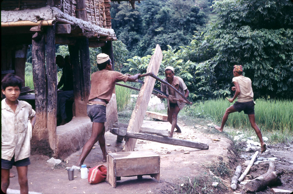 Date: 1966-06 Location: Rupakot, Gulmi Description: Carpenters saw a timber beam used in house construction and repair.