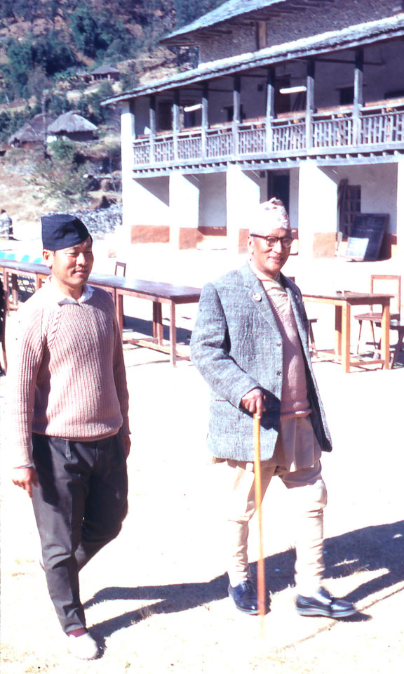 Description: Bharse High School's Founding Day celebration. On this occasion one of Bharse's most important citizens visited his village and the school. Giri Prasad Burathoki (on right) served Nepal as its Defense Minister during the reign of King Mahendra. Dhan Bahadur (on left) was the school's Headmaster.