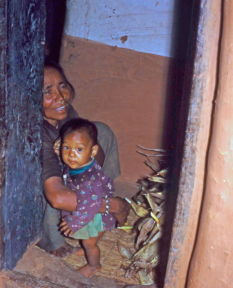 Date: 1966 Location: Johang, Gulmi Description: Grandmother was removing kernels from the corn cobs when her granddaughter came in from outside.