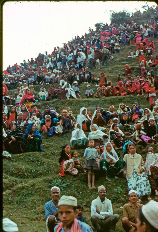 Date: 1966-10 Location: Johang, Gulmi Description: Villagers congregated for Dashain (Deshera) celebrations.