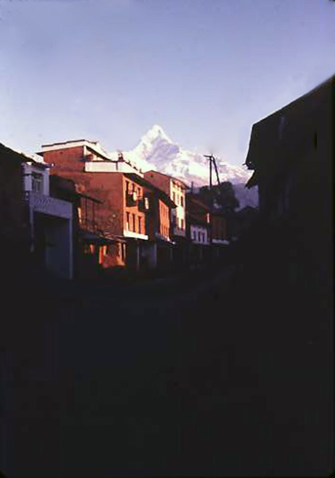 Date: 1966-01 Location: Pokhara, Kaski Description: Machhapuchchhre as seen from the main bazaar area of Pokhara.