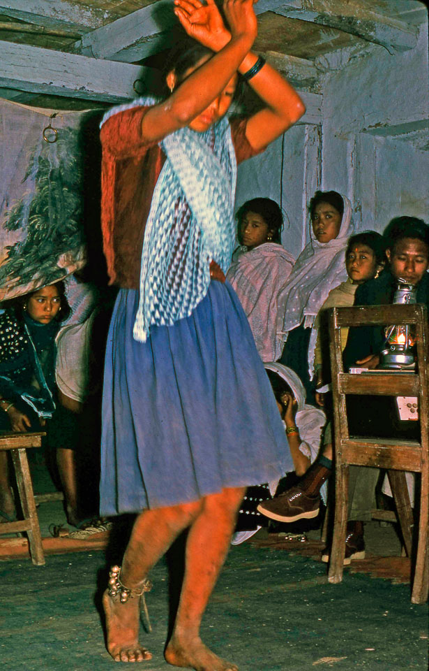 Date: 1966 Location: Bharse, Gulmi Description: Bharse High School student Hira Maya performs a dance as part of the school play.