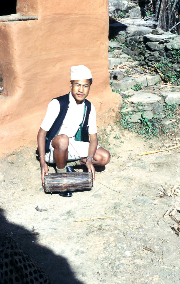 Date: 1966 location: Bharse, Gulmi Description: A Bharse High School student, wearing traditional dress, prepares for the Purnima celebration.