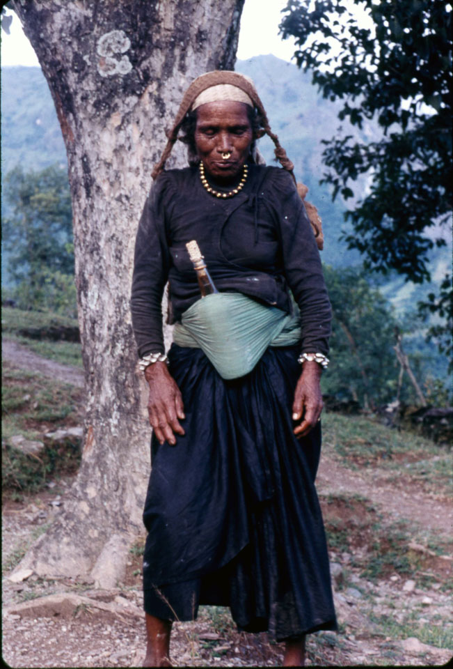 Date: 1966-11 Location: Bharse, Gulmi Description: Village woman with namlo and bottle of rakshi. On her way to a Purnima celebration, she stopped for a short rest on the side of the trail.