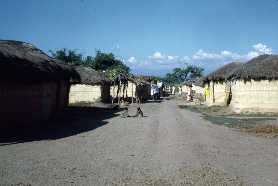 Description: Villagers in a village near Biruwa Guthi. Biruwa Guthi is a small village to the west of Jitpur, which is on the hardtop road that leads to Birgunj. Picture may be taken toward the north, with Nepal foothills in the background. Keywords: Bob Nichols, Nepal Photo History Project, Peace Corp Photo History, community, landscape, street scene, town, village