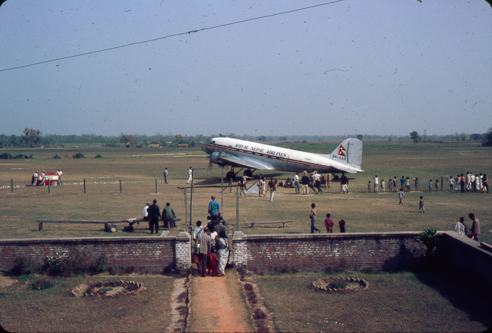 Description: Simara Airport, with Royal Nepal Airlines DC3. DC3s made regularly scheduled flights between Simara and Kathmandu. The airfield was not paved. Keywords: Bob Nichols, Nepal Photo History Project, Peace Corp Photo History, airfield, airplane, transportation