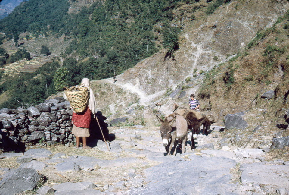 Description: Trail scene; woman with basket and donkeys in front. A woman trekker from England in rear. Keywords: Bob Nichols, Nepal Photo History Project, Peace Corp Photo History, footpath, pack animal, transportation