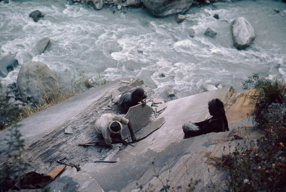 Caption: Date: 1967-10 Location: Baglung Description: "Harvesting" slate above the Kali Gandaki River. Keywords: Bob Nichols, Nepal Photo History Project, Peace Corp Photo History, handicrafts, landscape, other craft, river, stream