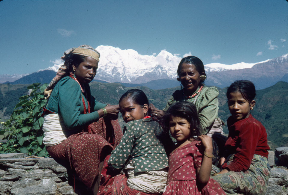 Description: Women and children with Annapurna South and Hiun Chuli behind. Picture taken on the Pokhara-Jomsom trek. Keywords: Bob Nichols, Families, Family, Nepal Photo History Project, Peace Corp Photo History, People, group photo, landscape, named mountain