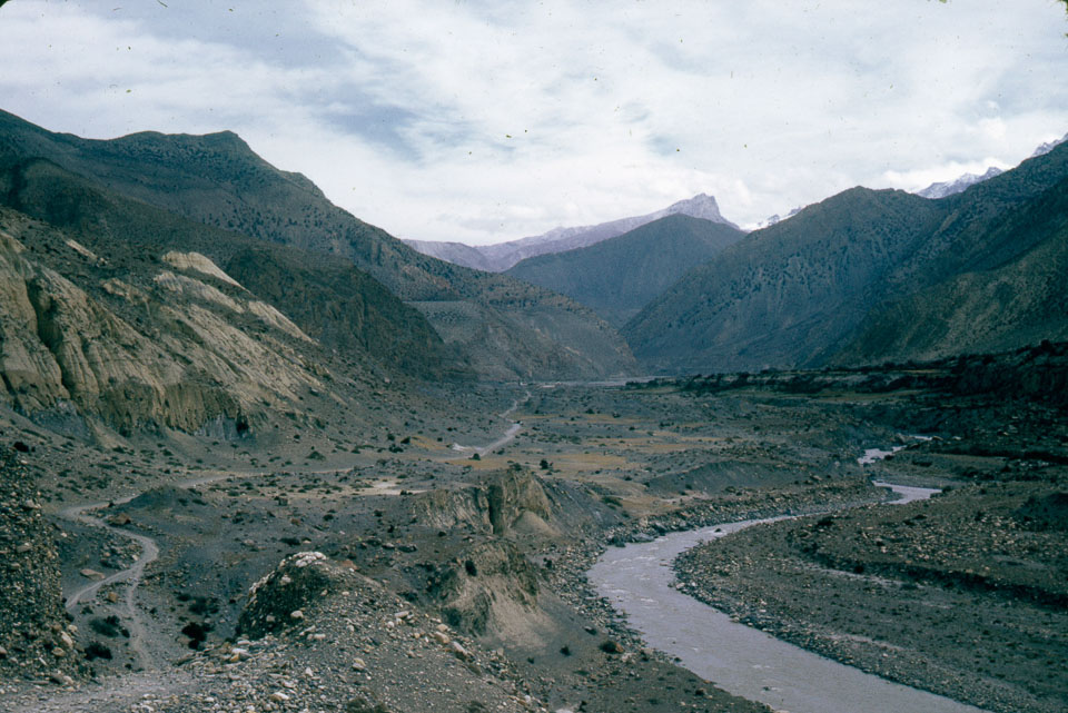 Caption: Date: 1967-10 Location: Mustang Description: Trail (left) along the Kali Gandaki. Keywords: Bob Nichols, Nepal Photo History Project, Peace Corp Photo History, countryside, footpath, landscape, river, stream, transportation