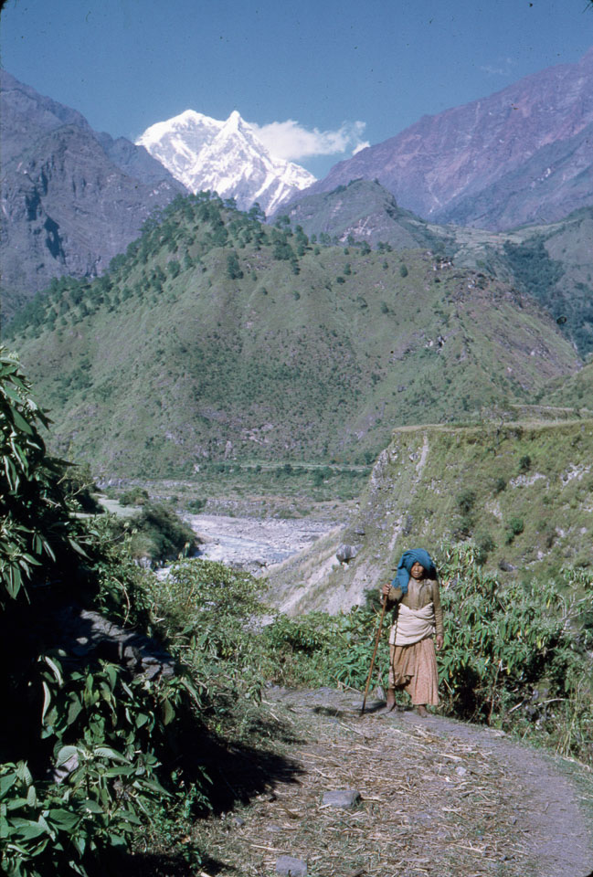 Description: Woman on the trail above the Kali Gandaki River, possibly near Tatopani. Keywords: Bob Nichols, Nepal Photo History Project, Peace Corp Photo History, countryside, footpath, landscape, river, stream, transportation