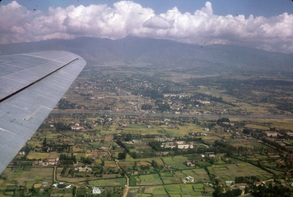 Caption: Date: 1966-1971 Location: Kathmandu Description: Kathmandu Valley, panorama, from the air. Keywords: Bob Nichols, Nepal Photo History Project, Peace Corp Photo History, aerial view, landscape