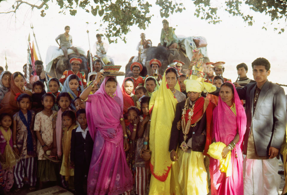 Description: Wedding scene. Groom on right, between the two women. Band and elephants at the rear may be from India. Keywords: Bob Nichols, Nepal Photo History Project, Peace Corp Photo History, elephant, event, transportation, wedding
