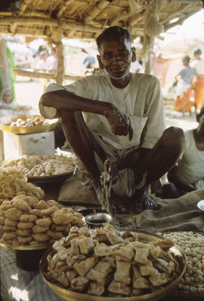 Caption: Date: 1966-1968 Location: Biruwa Guthi, Parsa Description: Sweet seller at the weekly market. Keywords: Bob Nichols, Nepal Photo History Project, Peace Corp Photo History, commerce, haat, market, shop