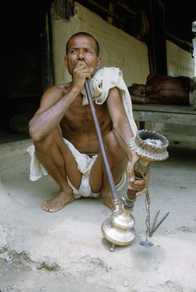 Caption: Date: 1966-1968 Location: Basadilwa, Parsa Description: Man smoking a hookah and second man sleeping, behind. Keywords: Bob Nichols, Nepal Photo History Project, Peace Corp Photo History, People, portrait