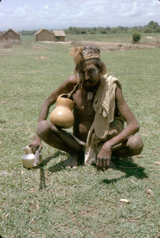 Description: Sadhu. Picture taken by the panchayat house, looking north; low or outcaste homes in back. Keywords: Bob Nichols, Nepal Photo History Project, Peace Corp Photo History, People, portrait, sadhu