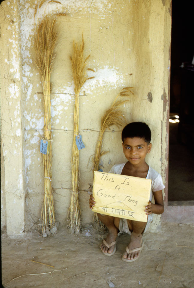 Description: Boy holding sign to advertise improved agricultural practices, in front of the panchayat house. From left to right, wheat stalks are improved grain with irrigation, improved grain without irrigation; unimproved grain without irrigation, respectively. The boy is the son of Dip Narayan Deo who worked in the Biruwa Guthi panchayat area as an agricultural extension agent (Junior Technical Assistant). Keywords: Bob Nichols, Nepal Photo History Project, Peace Corp Photo History, People, agriculture, child, produce