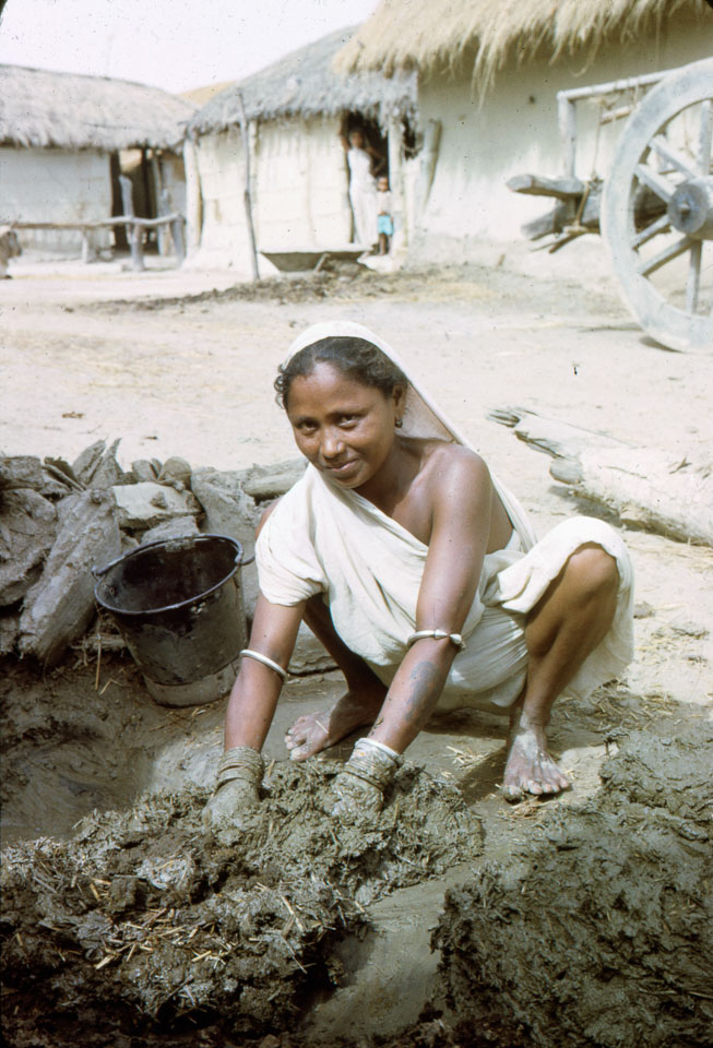 Caption: Date: 1966-1968 Location: Parsa Description: Woman making mud-dung mixture for remudding walls of a house. Keywords: Bob Nichols, Nepal Photo History Project, Peace Corp Photo History, home life, house exterior, lipnu