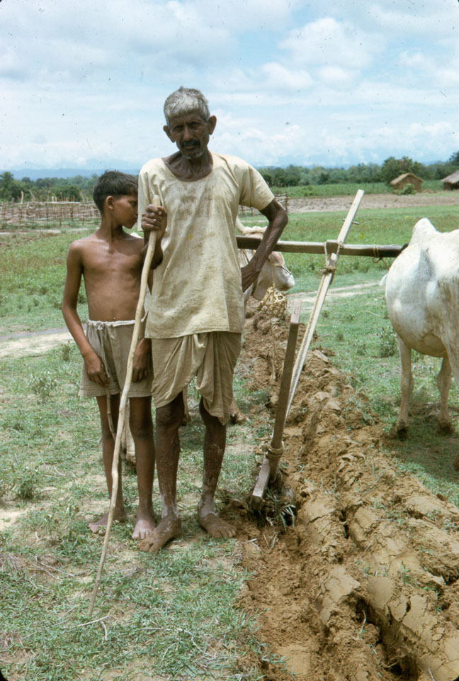 Description: Man, boy (maybe son) and bullocks, plowing. The plow used here was a single blade with a mold board, and was reported to be an improved implement that could replace the traditional plow (a steel rod, fitted into a wood base). Several of these new implements were used in Biruwa Guthi area. The mold board turned the soil over, as seen here, which was the intentional effect. However, the steel blade wore down very quickly making this version of the mold board plow non-effective after a short while. The plows were made in Birgunj. The picture is taken toward the north and Nepal's foothills. Keywords: Bob Nichols, Nepal Photo History Project, Peace Corp Photo History, agriculture, plowing, tilling