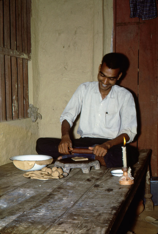 Description: Dip Narayan Deo, who worked in the Biruwa Guthi panchayat area as an agricultural extension agent (Junior Technical Assistant), flattens dough for bread (chapatis) in the panchayat house. Deo, a co-worker to the Peace Corps volunteer living in this house for two years, is sitting on a bed. Keywords: Bob Nichols, Nepal Photo History Project, Peace Corp Photo History, People, cooking, home life, named person