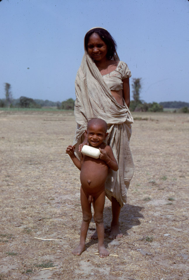 Description: Mother and son, in front of the panchayat house. They were outcastes who lived just to the north of the panchayat house, across a small ravine. Boy's name is Joginder. Distended stomach was common. Keywords: Bob Nichols, Nepal Photo History Project, Peace Corp Photo History, People, named person, portrait