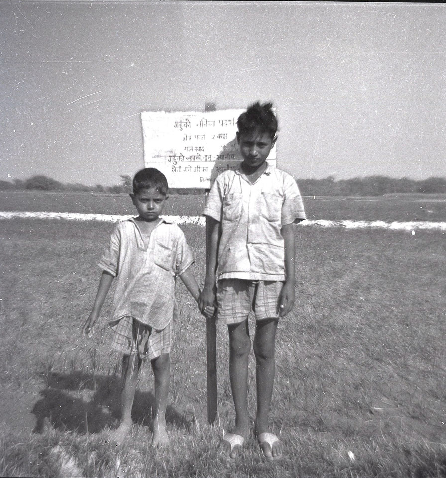 Caption: Date: 1967 Location: Biruwa Guthi, Parsa Description: Two boys from the family of Babu Sahib, the large landowner from the village, standing in front of a wheat demonstration project. Keywords: Bob Nichols, Nepal Photo History Project, Peace Corp Photo History, People, agriculture, child, field, named person
