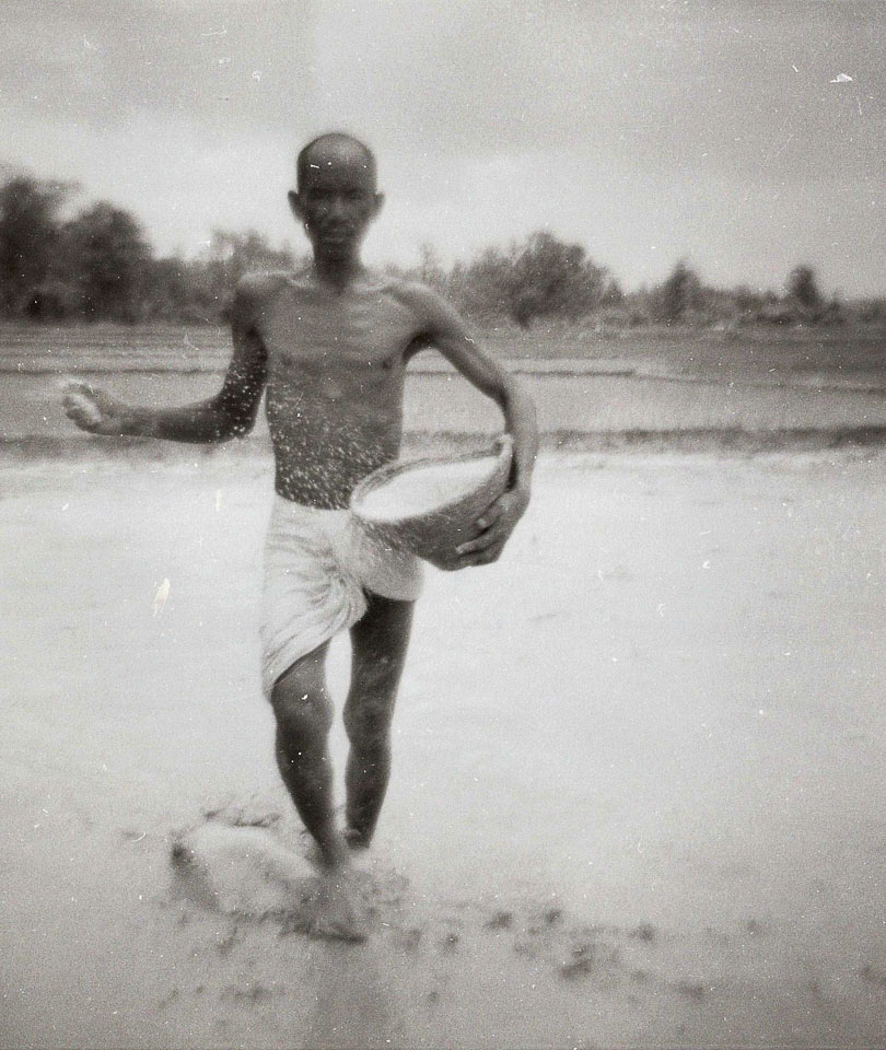 Caption: Date: 1967 Location: Parsa Description: Farmer broadcasting rice seed for rice demonstration project in Biruwa Guthi Panchayat. Farmer's name may be Deo Nun Choudary. Village name may be Solukpur. Keywords: Bob Nichols, Nepal Photo History Project, Peace Corp Photo History, People, agriculture, named person, paddy, planting