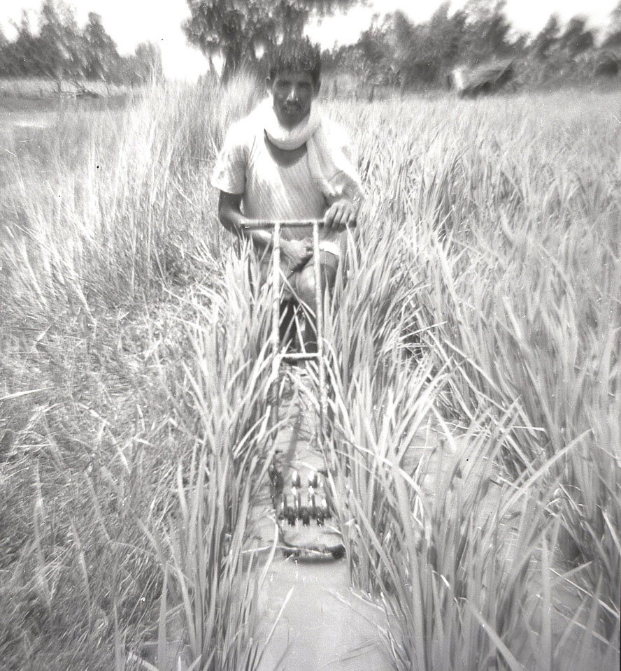 Caption: Date: 1967 Location: Parsa Description: Field demonstration of new agricultural tool (rice cultivator), to be used between rows of rice). Keywords: Bob Nichols, Nepal Photo History Project, Peace Corp Photo History, agriculture, home life, paddy, tools