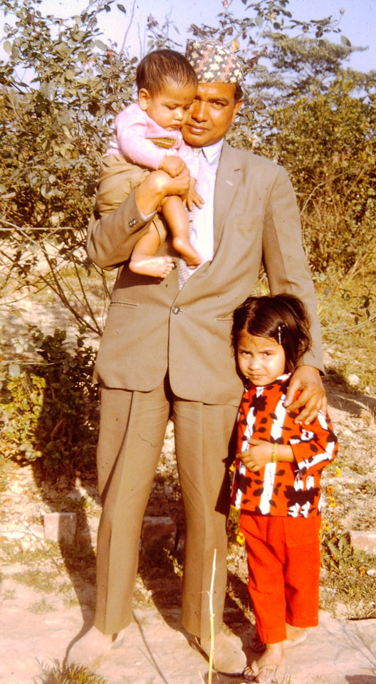 Caption: Date: 1970-05 Location: Janakpur, Dhanusa Description: Devendra Singh, K.C. and his children. He ran the Nepal Railway from Raxaul, India to Birganj in the 1960s before being transferred to Janakpur to run the railway there. When he said he managed "the Nepal Railway" in Birganj, he would burst out laughing because the line from Raxaul to Birganj was so short. He was a charismatic fellow. His extended family owned land in the Biruwa Guthi panchayat; it was managed by his brother, Madan Singh, K.C. Keywords: Bob Nichols, Families, Family, Nepal Photo History Project, Peace Corp Photo History, People, named person, portrait