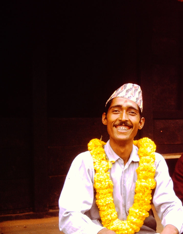 Caption: Date: 1969-10 Location: Hile, Dhankuta Description: Man with flower garland around neck, perhaps connected with the Dashain festival. This man lived on the right side of the main street, going east toward the end of the street. Keywords: Bob Nichols, Nepal Photo History Project, Peace Corp Photo History, People, portrait
