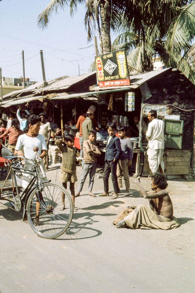 Caption: Date: 1969-1971 Location: Biratnagar, Morang Description: Street scene and beggar Keywords: Bob Nichols, Nepal Photo History Project, Peace Corp Photo History, bazaar, commerce