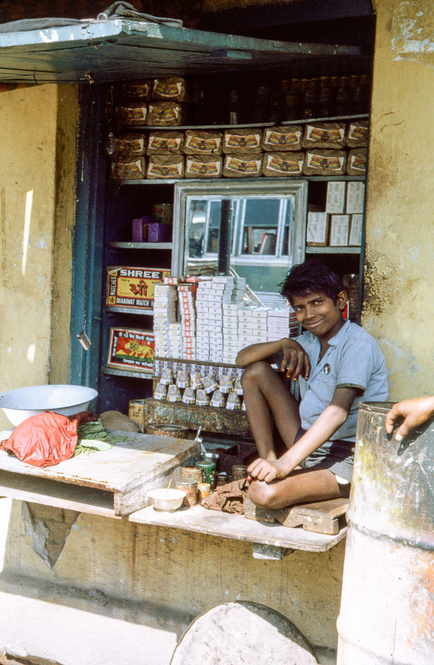 Caption: Date: 1969-1971 Location: Biratnagar, Morang Description: Boy street vendor in Biratnagar, selling bidis and cigarettes. Keywords: Bob Nichols, Nepal Photo History Project, Peace Corp Photo History, commerce, shop